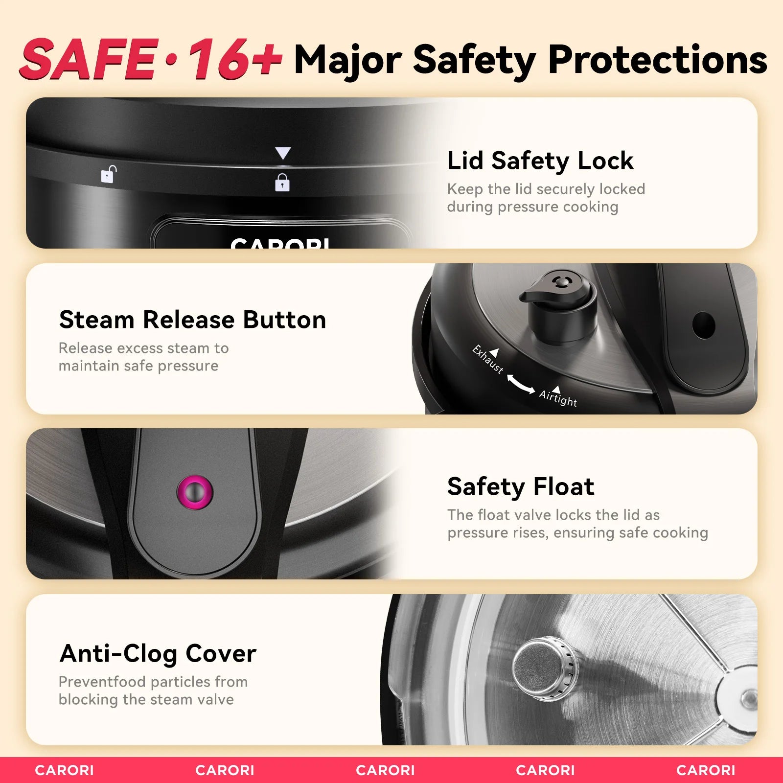 16+ Built-in Safety Features for Peace of Mind: Say goodbye to olla de presion worries! With over 16 advanced safety features, including a steam release button, lid safety lock, overheat protection, leak-proof design, and pressure limit protection, this pressure cooker electric is designed to prioritize your safety.