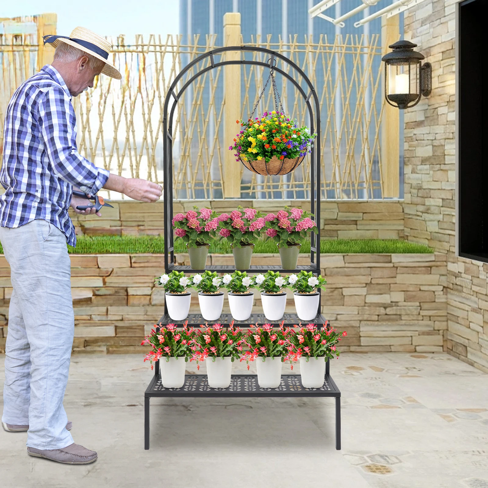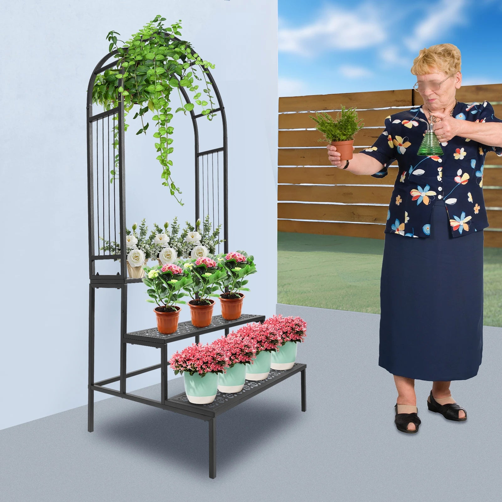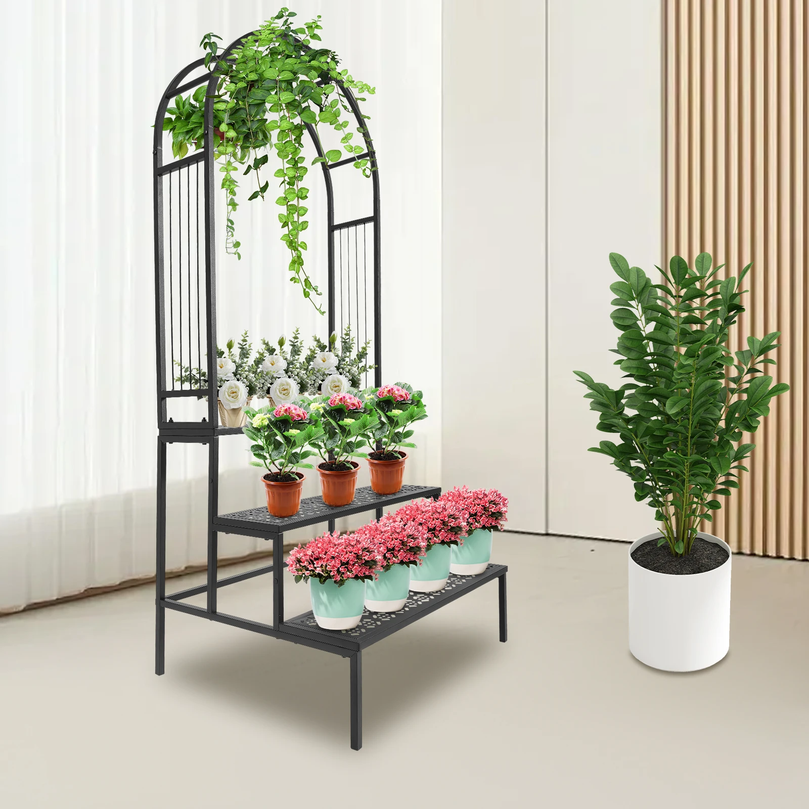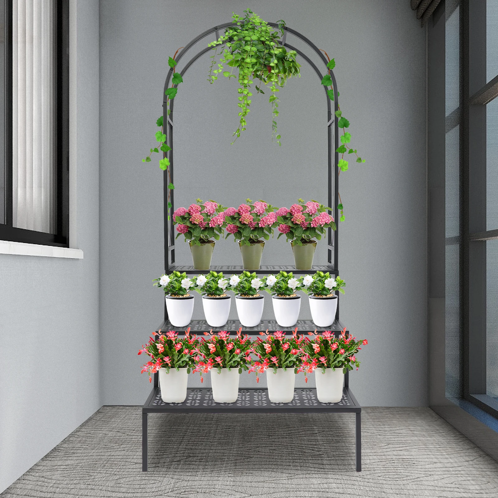 Thoughtful Design: The open design, stepped three-tier shelves and hollowed-out tiers allow greenery and potted plants (not included) to fully receive the nourishment of sunlight and rain. The arch design is very conducive to the growth of climbing plants.