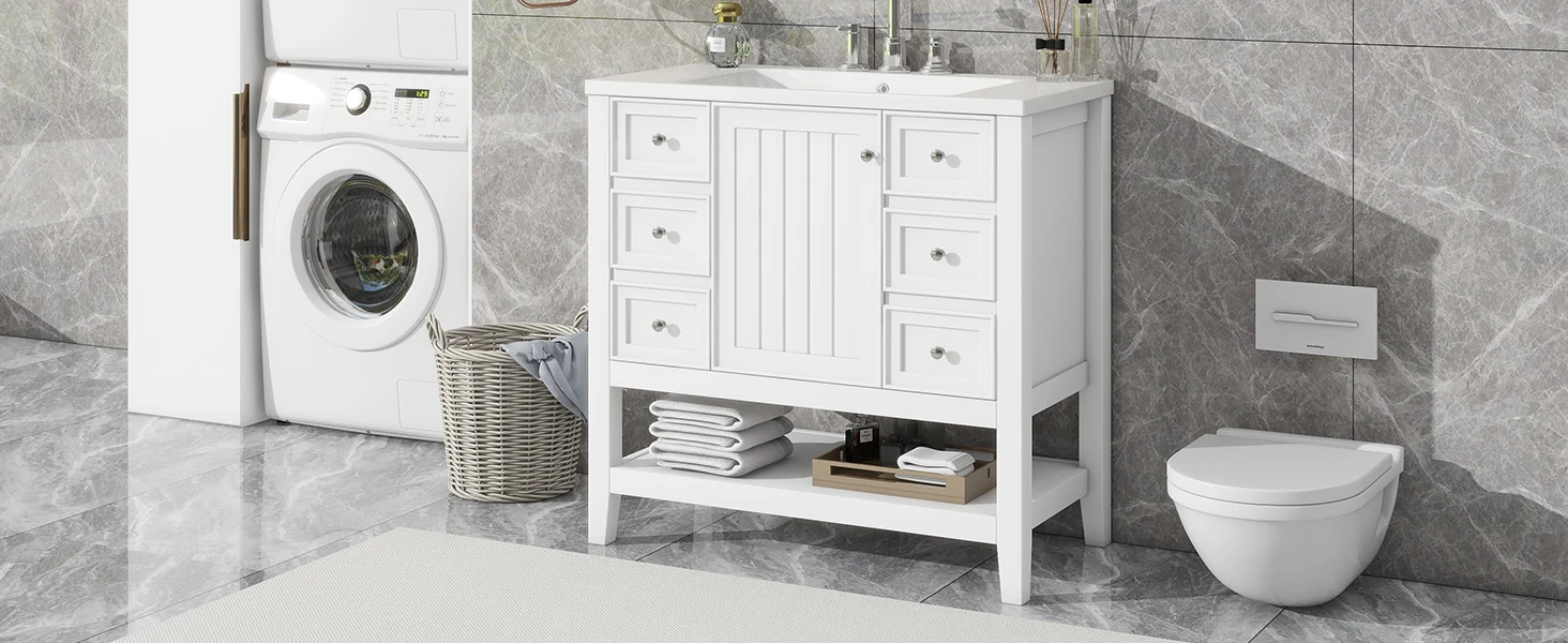 【Stylish 36" Bathroom Vanity】This 36" bathroom vanity cabinet features a pure color cabinet with a white countertop creating a refreshing color combination that catches the eye. Its sleek lines and gold handles add a modern touch, enhancing the aesthetics of your bathroom