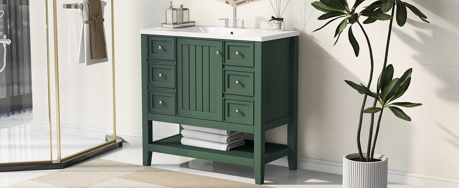 【Solid Wood Freestanding Bathroom Vanity】This bathroom vanity with sink is made of solid wood for the frame and MDF boards for doors and plates, increasing the product stability and ensuring long-lasting use. Furthermore, the surface of this vanity cabinet is finished with waterproof paint. It is waterproof, stain-proof, and very easy to clean
