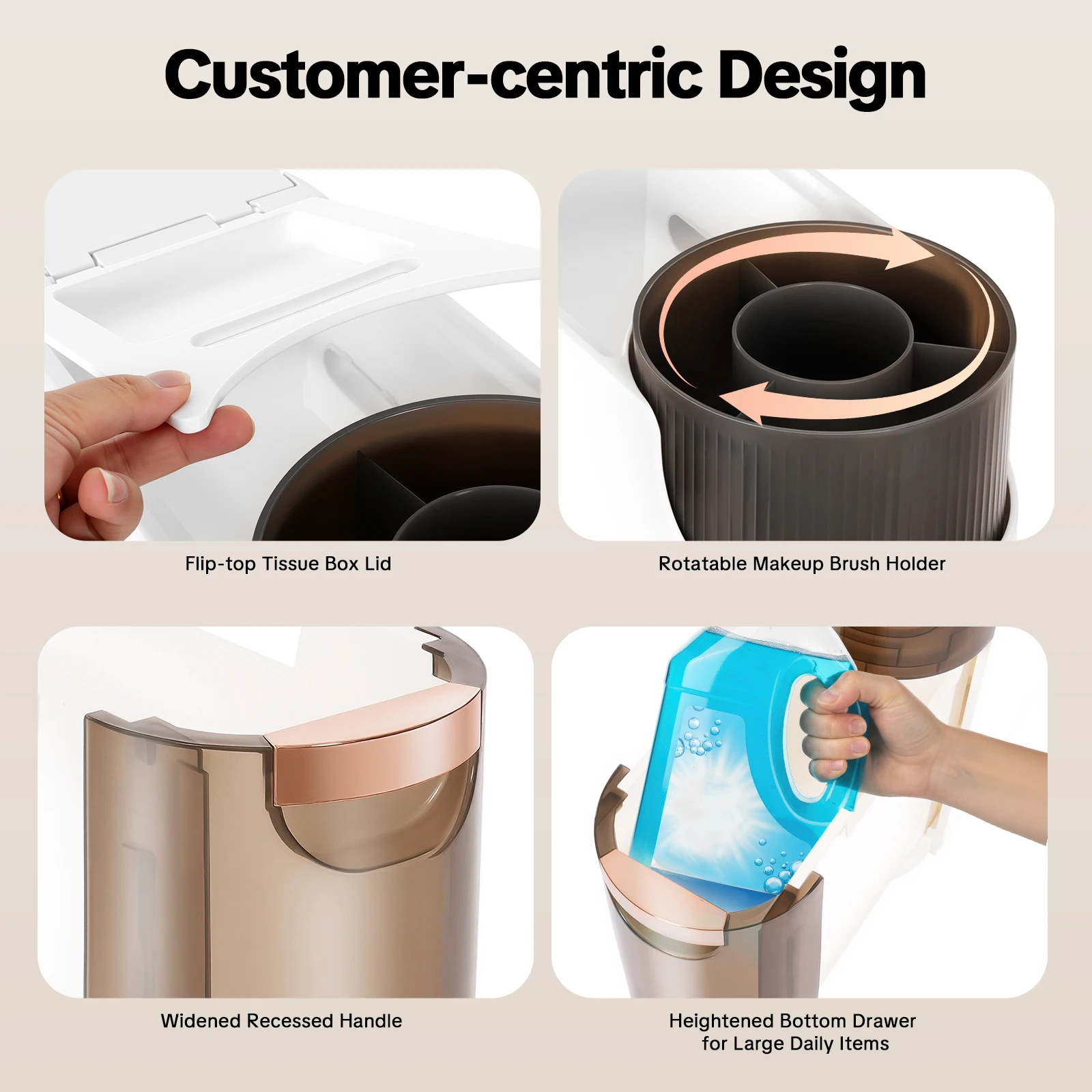 Large Capacity: The heightened bottom drawer ( 5.71*15.7*11.61 inch) is convenient for you to put tall bottles of shampoo, and laundry detergent, and the three smaller drawers (each: 5.70*15.7*5.12inch) are for you to organize different items such as cosmetics, toiletries, cleaning products, and so on. In addition, the top platform which has a rotatable storage box with 3 storage compartments, a top groove storage, and a private item storage is also convenient for you to store small items.