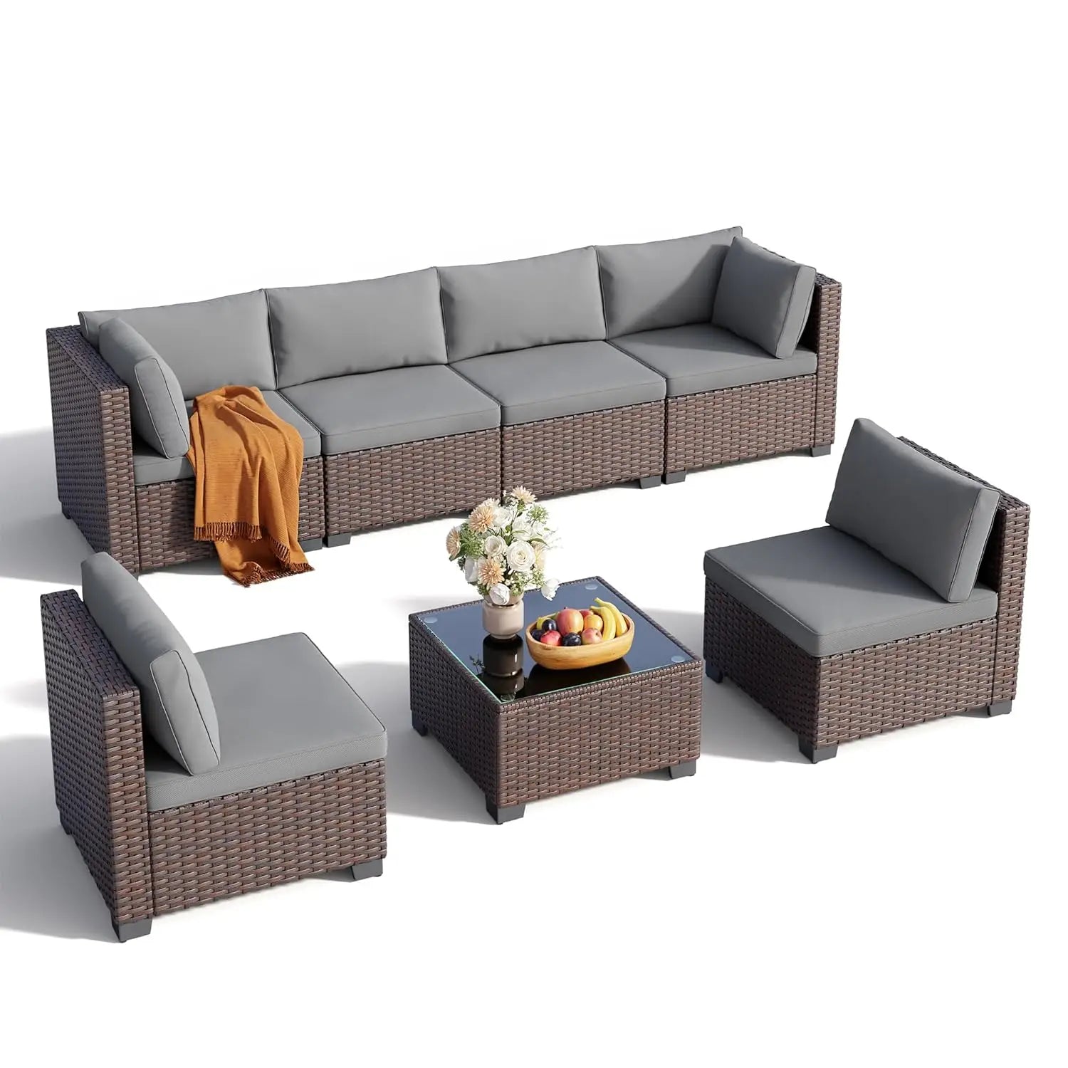 Package Included (7-piece set) : This outdoor sectional furniture set is divided into 3 packages. The wicker furniture set includes: 2 corner chairs, 4 armless chairs, 1 glass coffee table