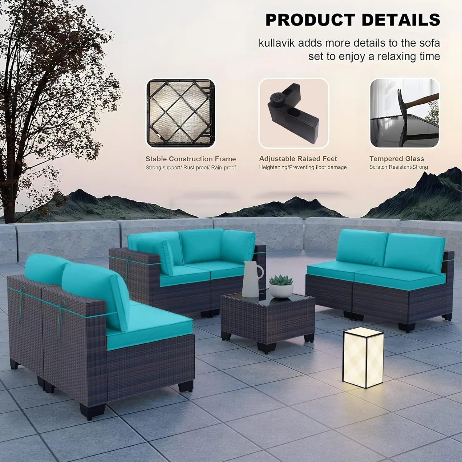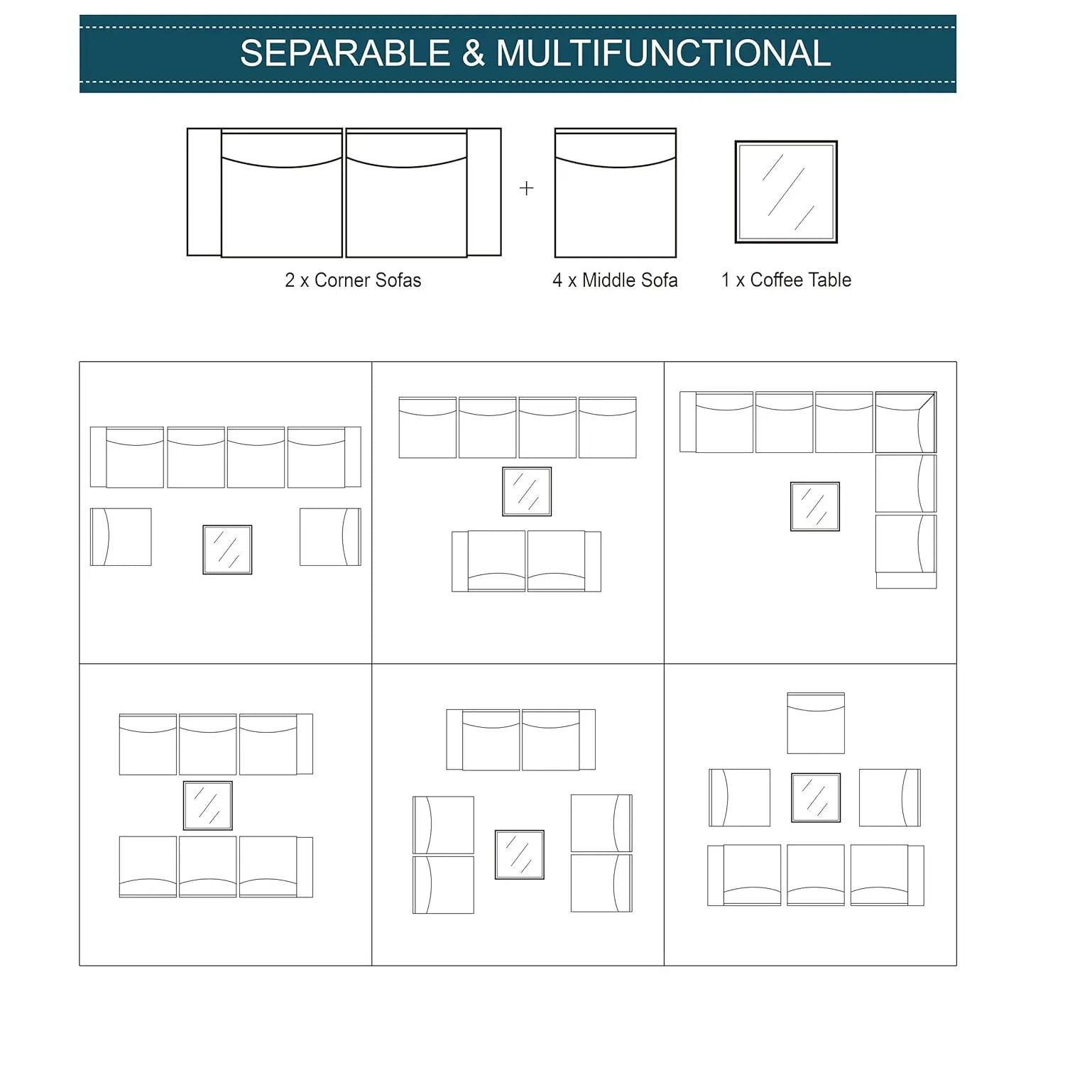 Combination Flexibility:The patio conversation set includes 2 corner sofas,4 middle sofas,1 coffee table.Whether it's a balcony,poolside or lawn, they all integrated in perfectly,allowing you to create a practical and beautiful outdoor meeting area as you wish.