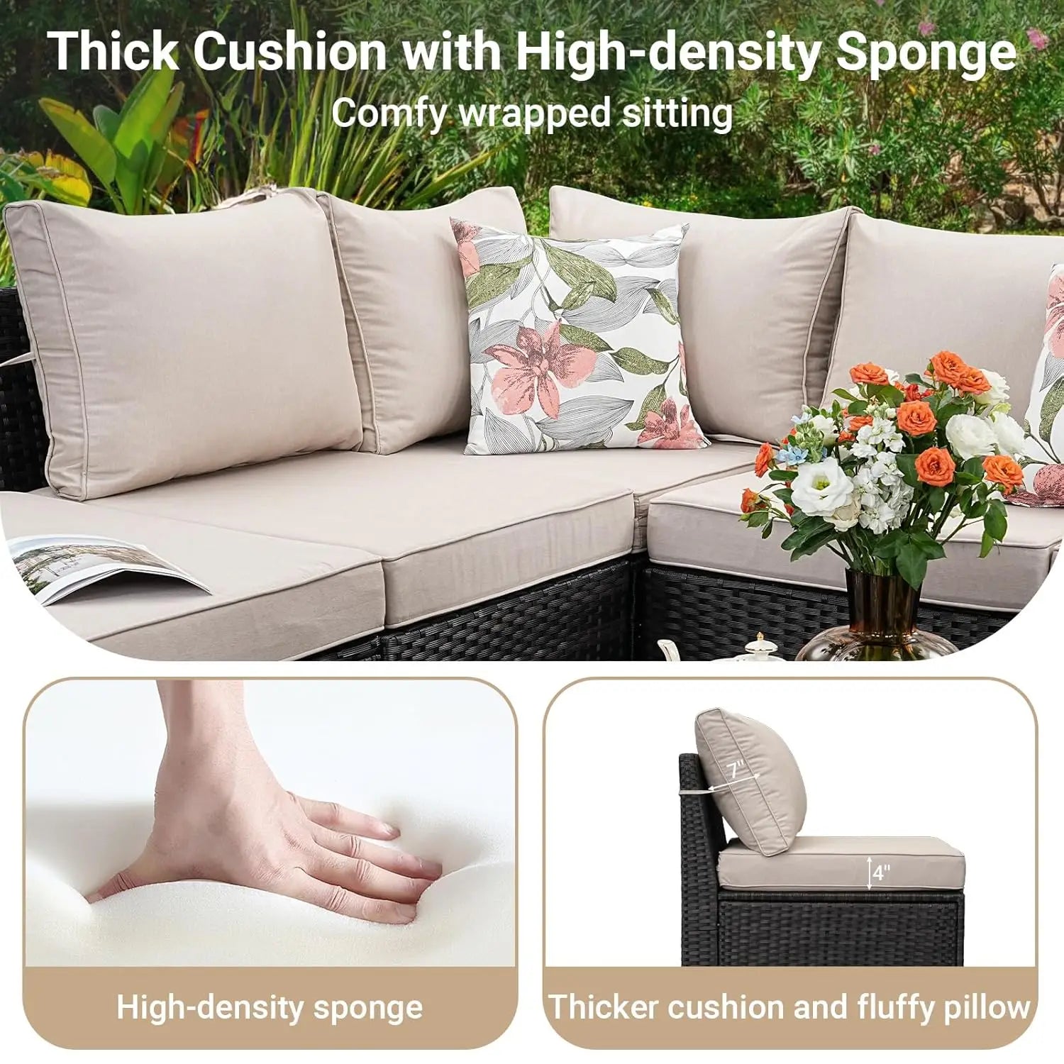EXTRA-WIDE ARMREST DESIGN WITH SOFT CUSHION:Our patio sectional set with 7.5‘’ wide armrest platform supports your entire arm from wrist to elbow,offering ample space for resting drinks, books.4-inch seat and back cushions are wrapped in water-resistant fabric, repelling light spills and moisture while maintaining a soft, inviting feel.
