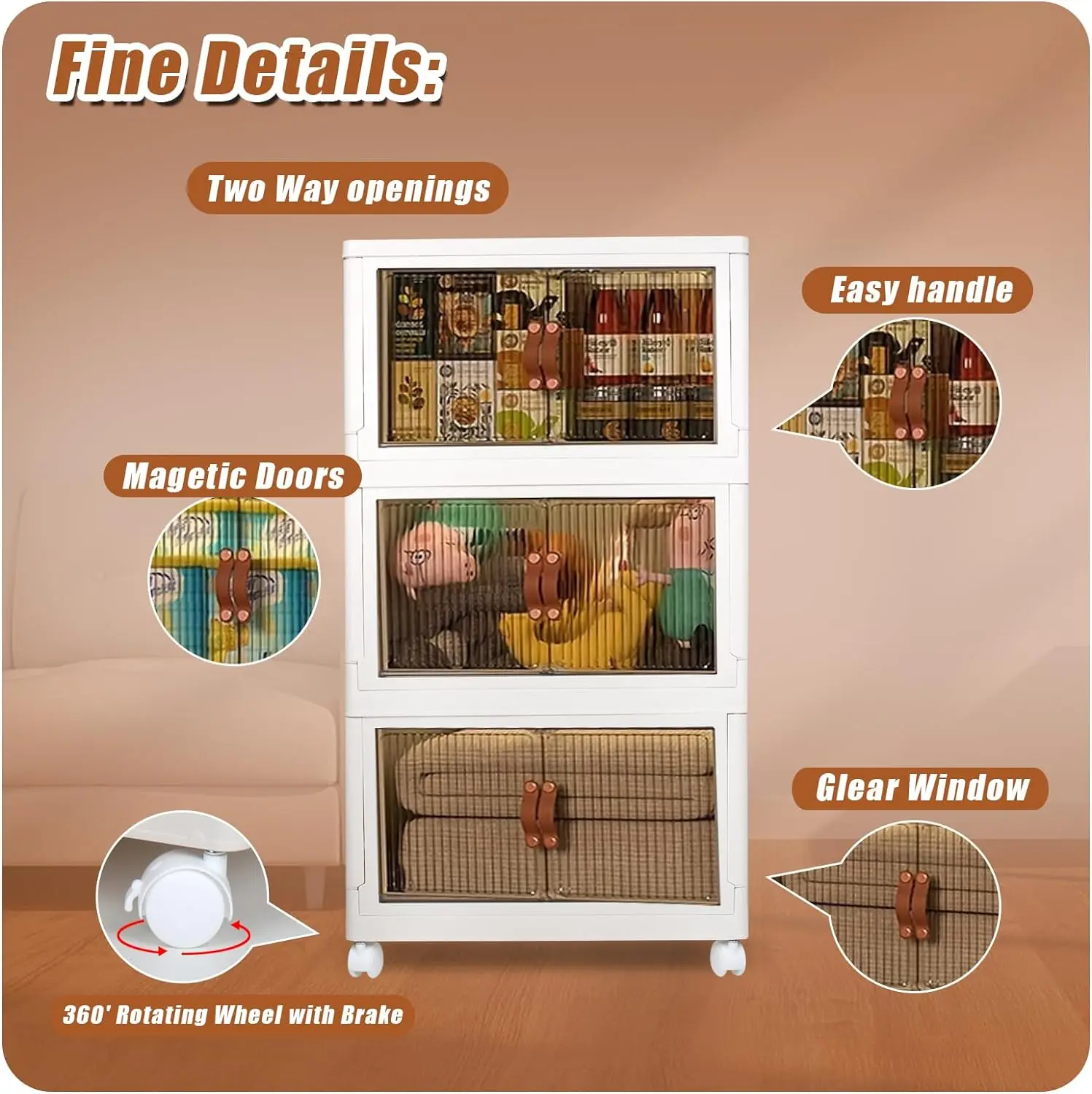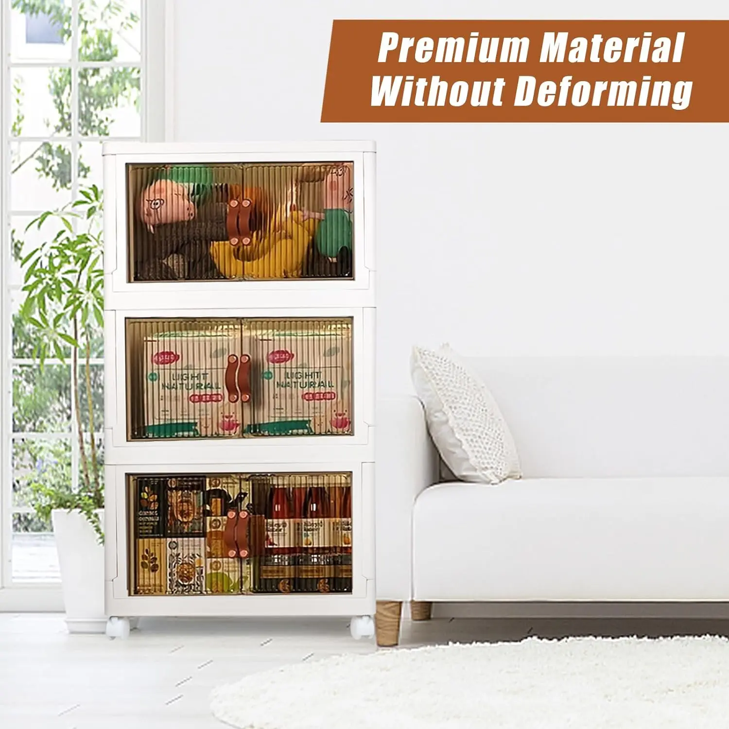 Household Storage Box with Lids and Doors, 3 Tilers of 8.8Gal Collapsible Stack-able Bins with Wheels for Office, Dorm Room