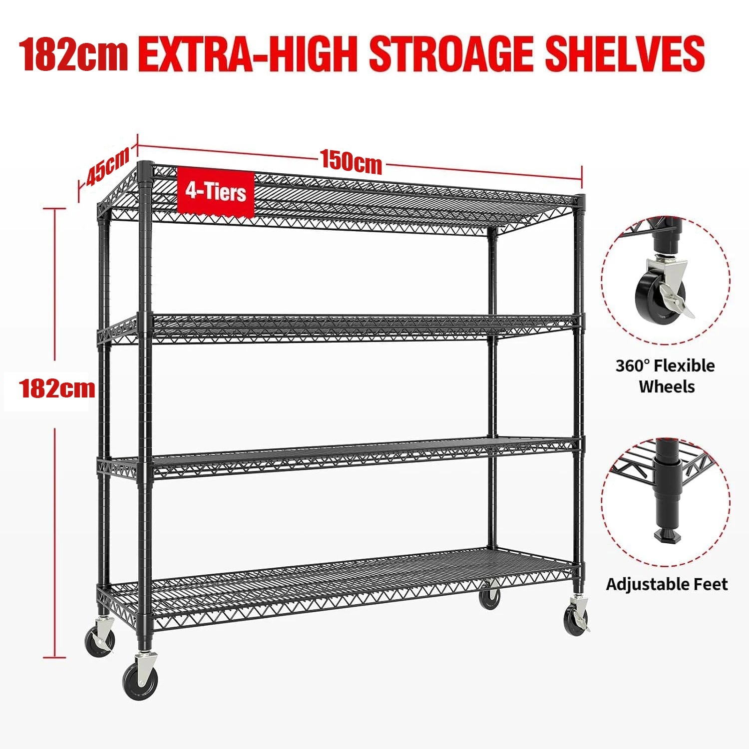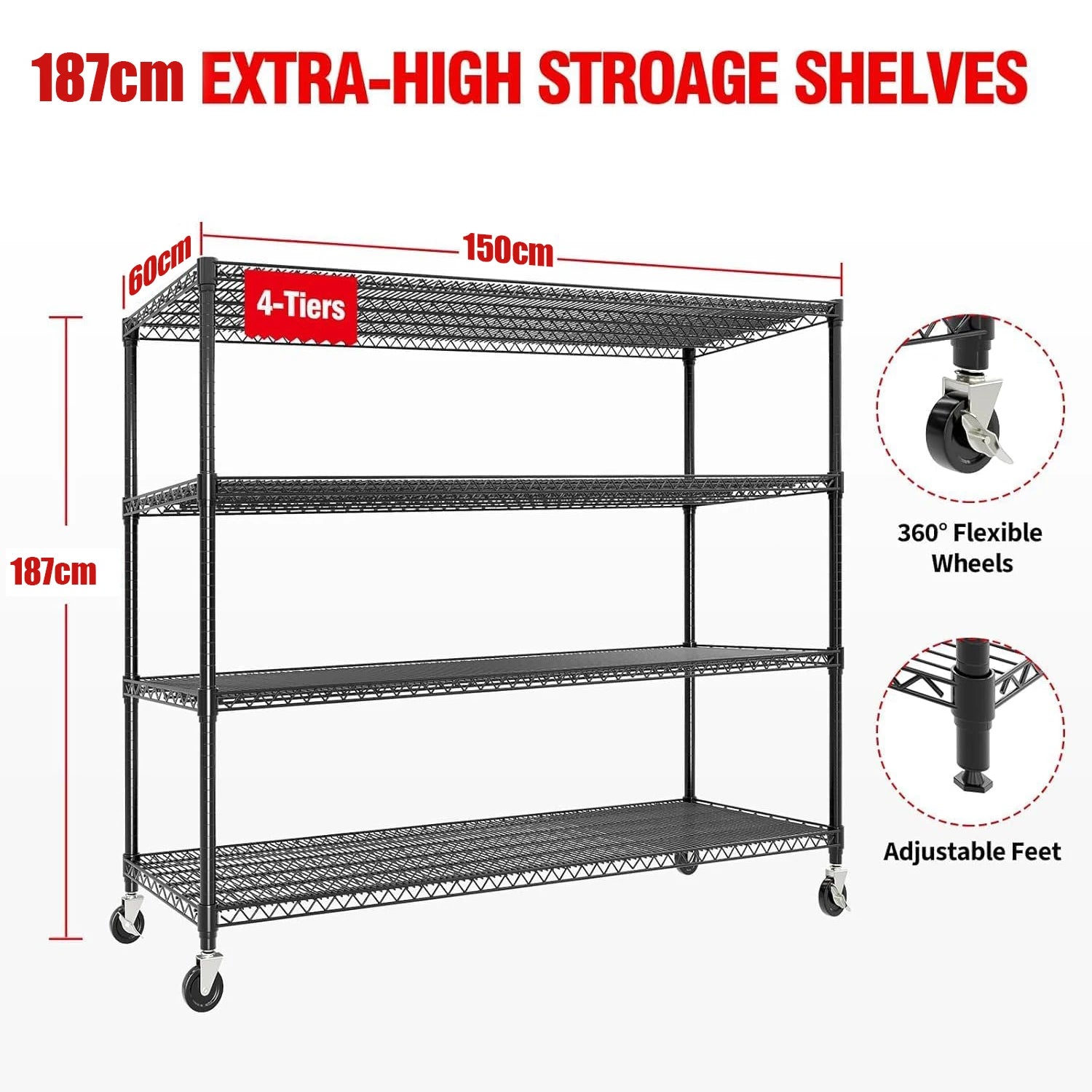 --- Easy to Move, Stable to Stay: As a versatile heavy duty metal shelving with wheels, it includes 4 x 3-inch swivel casters (2 with brake locks). It also works as metal shelving with wheels or storage shelves with wheels; when you need stability, replace the casters with included non-slip fixed feet to keep it steady in garages or warehouses (no wobbling if bumped).