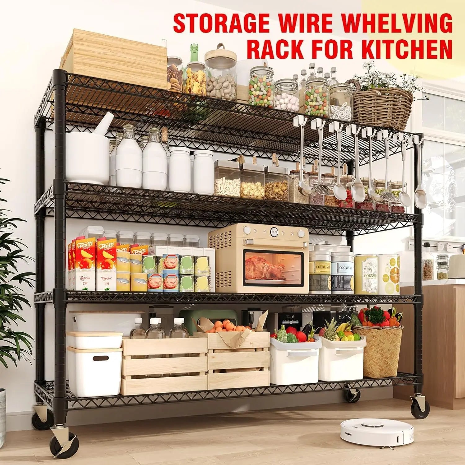 --- Industrial Heavy-Duty Strength: Crafted as heavy-duty metal frame, this standing shelving unit features 25.4mm diameter thickened metal rods with 1.2mm wall thickness. Each tier supports up to 660LBS (≈300kg), with a total weight capacity of 2640LBS(4 Tier)/ 3300LBS(5 Tiers), perfect for industrial heavy duty storage shelves needs. It holds cast iron pans, microwaves, or commercial ovens without sagging or bending, serving both home use and commercial use (hardware storage).