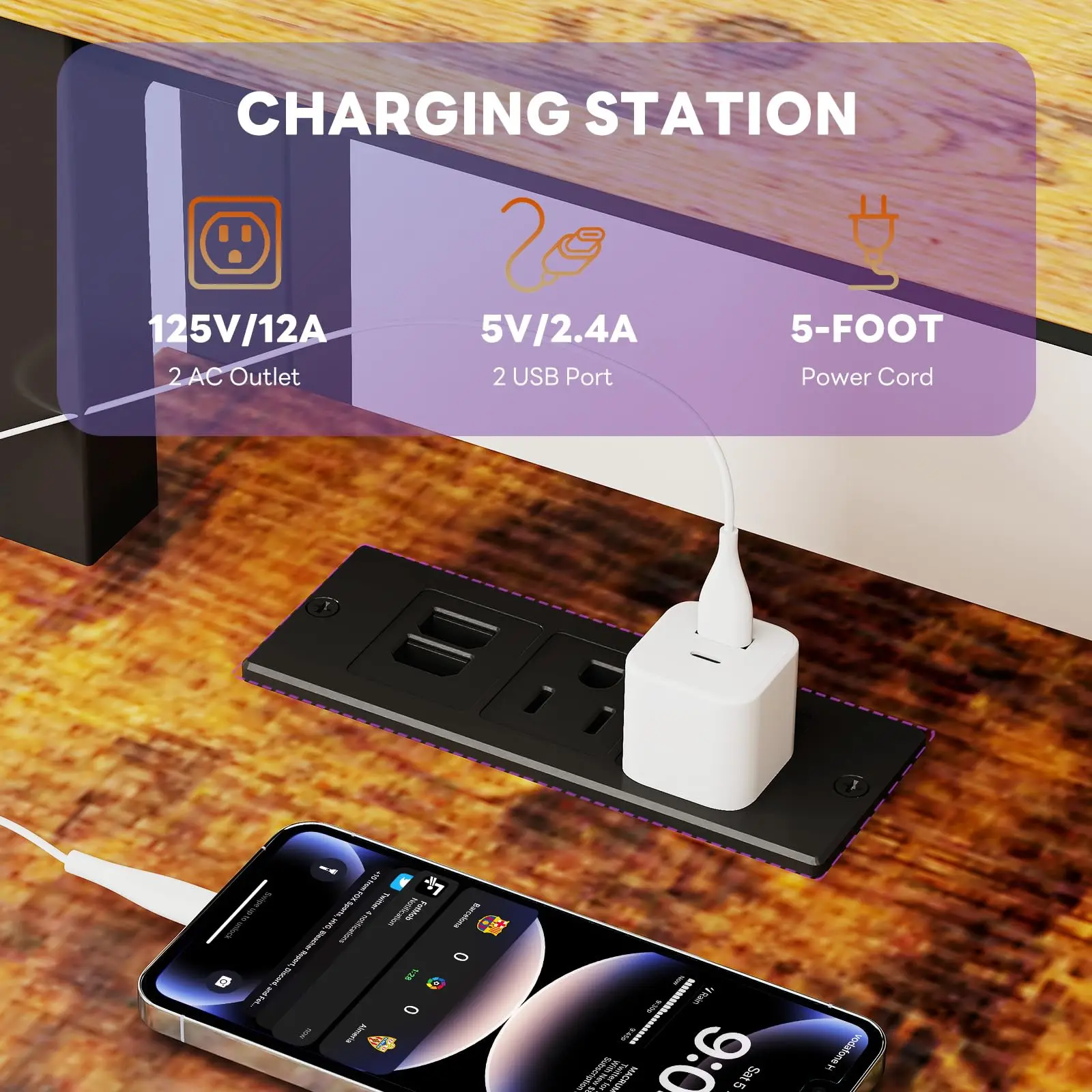 Built-in Charging Station: Stay powered up and cord-free! This desk features a built-in power strip with 2 AC outlets and 2 USB ports, allowing you to conveniently charge your phone, laptop, and other devices right from your desktop.
