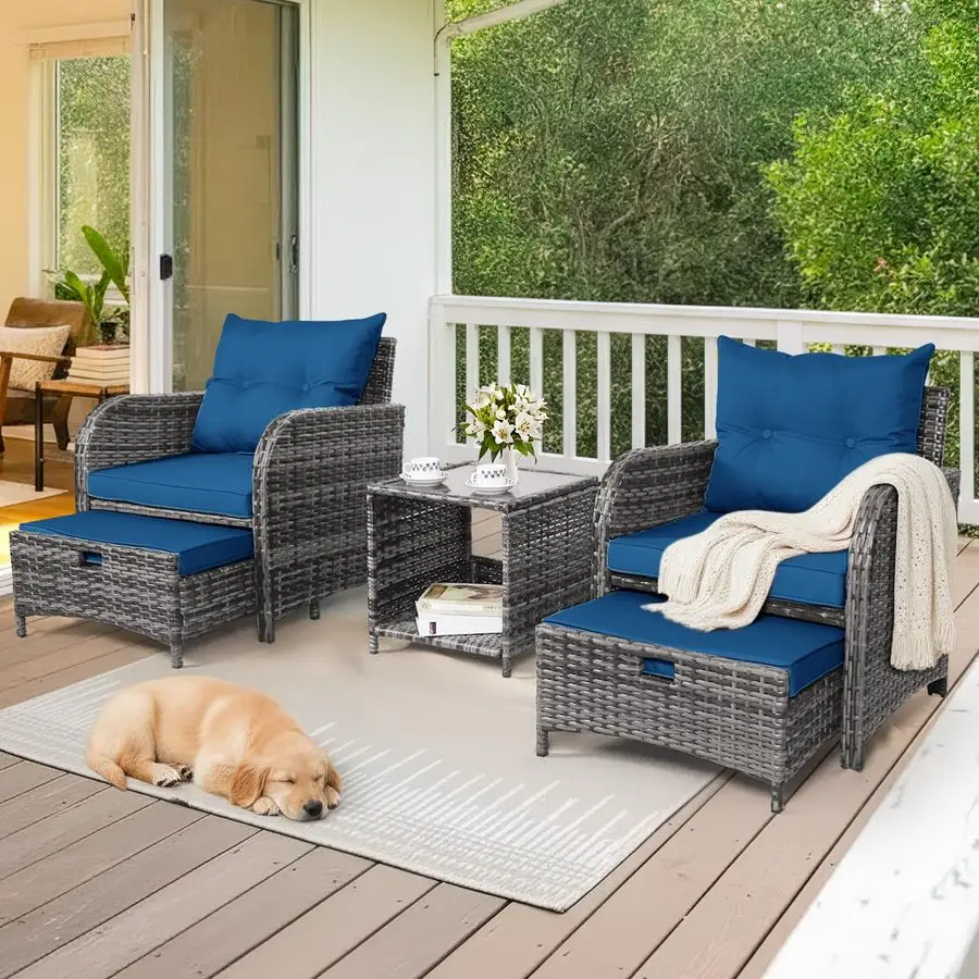 Packing Included The 5 pieces outdoor patio chair sets with ottomans includes 2 x single armchairs, 2 x footstools and 1 x end table. The tools and instructions needed for installation will also be in the box
