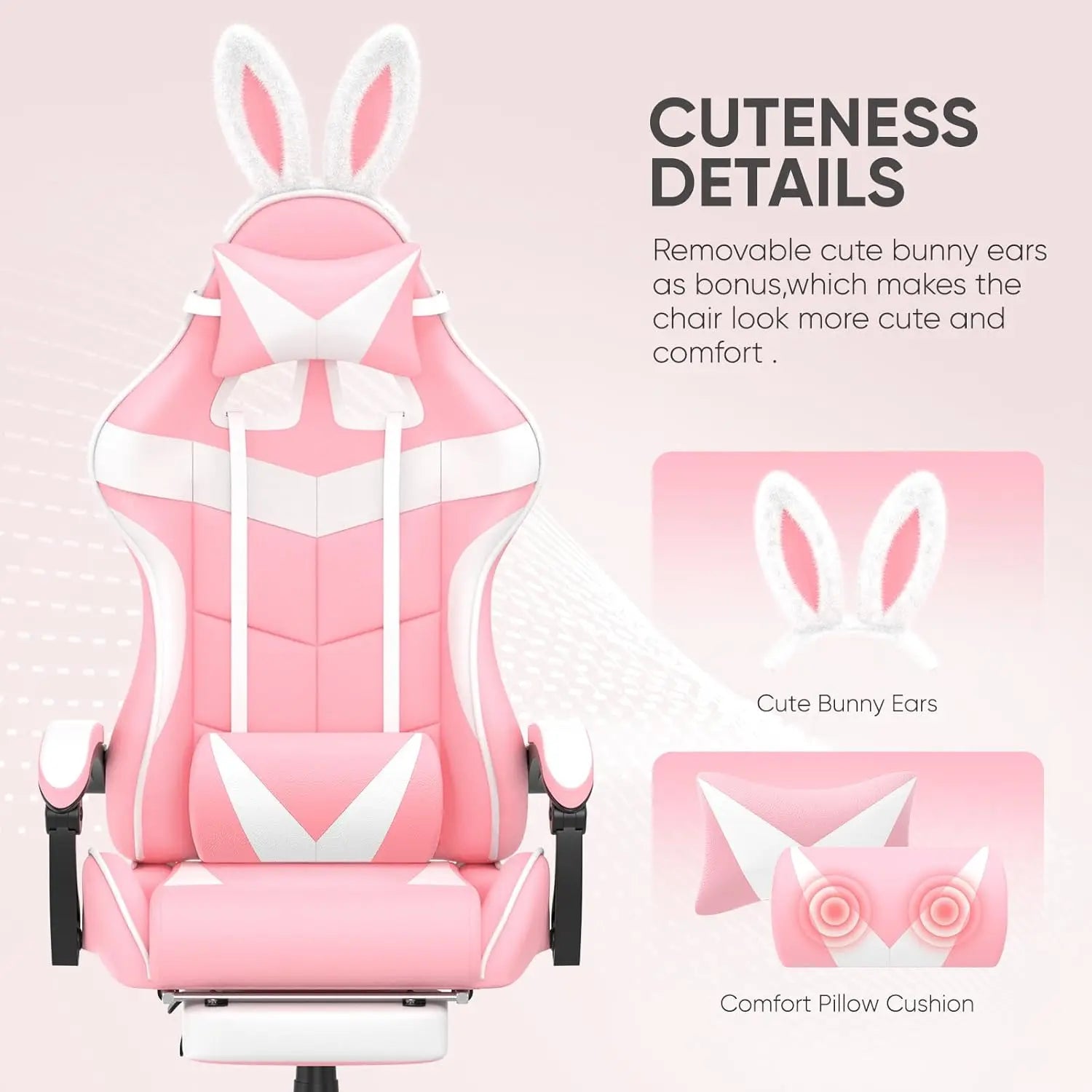 Pink Ergonomic Gaming Chair with Bunny Ears Footrest Headrest Lumbar Support for Home Office PC, Customized