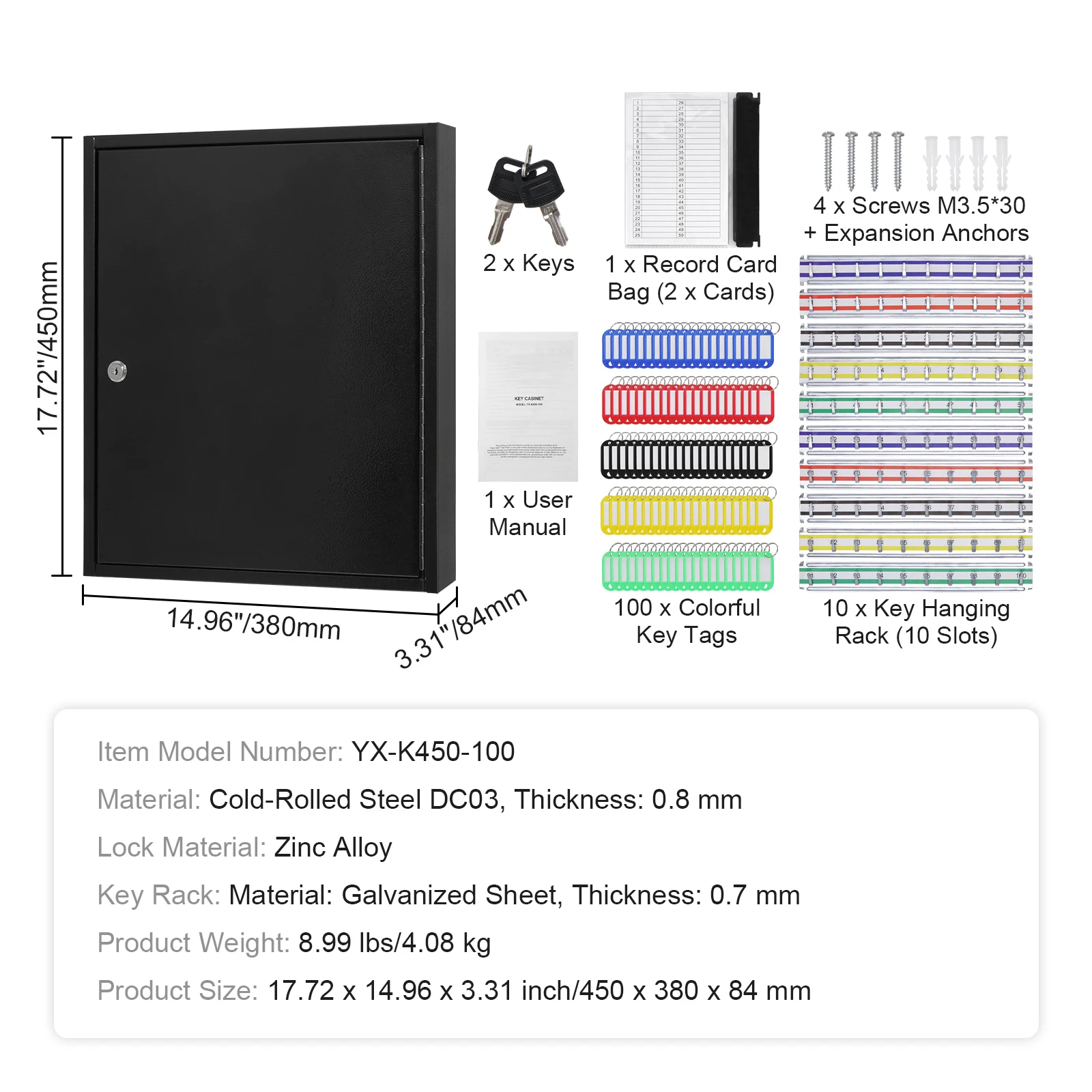 Constructed with corrosion-proof cold-rolled steel, this key storage cabinet features long-lasting use. 0.8 mm cabinet panel can withstand impacts and pressure from daily use, ensuring the secure storage of keys.